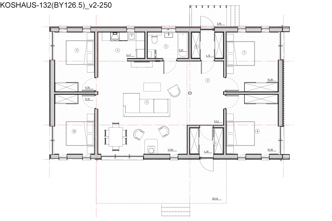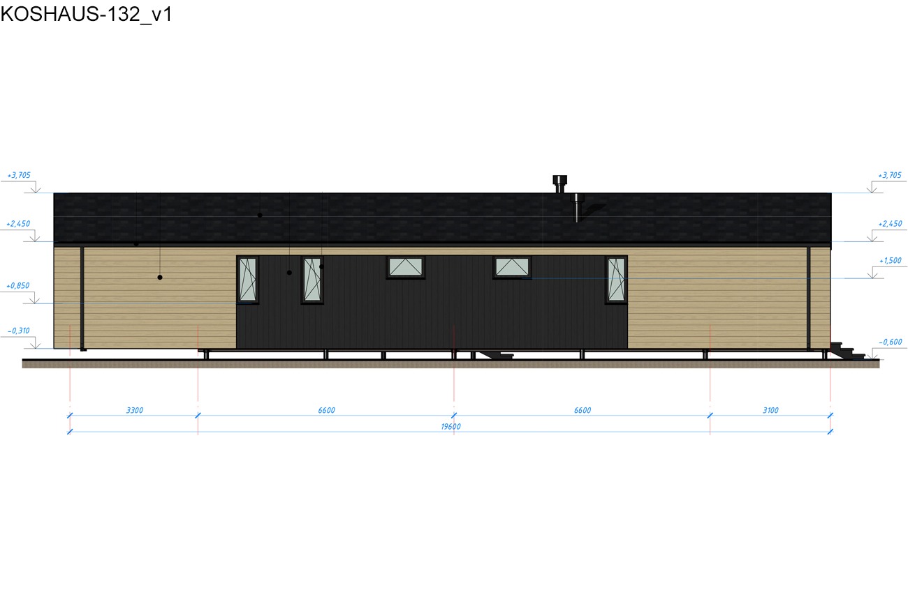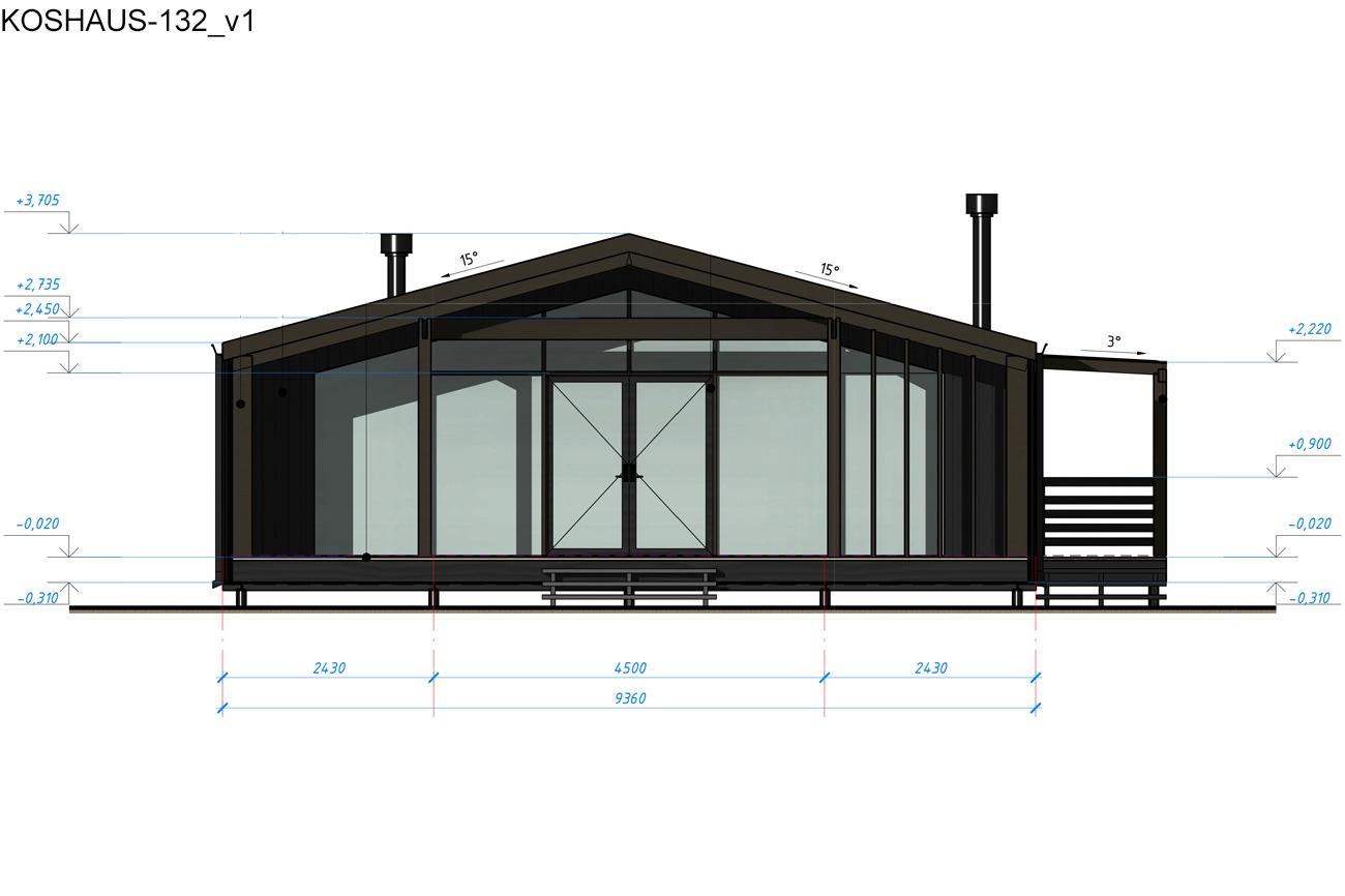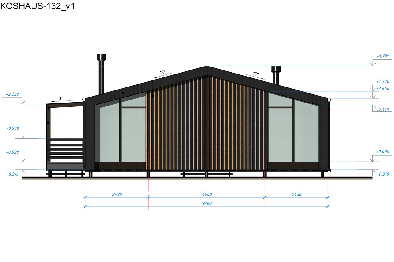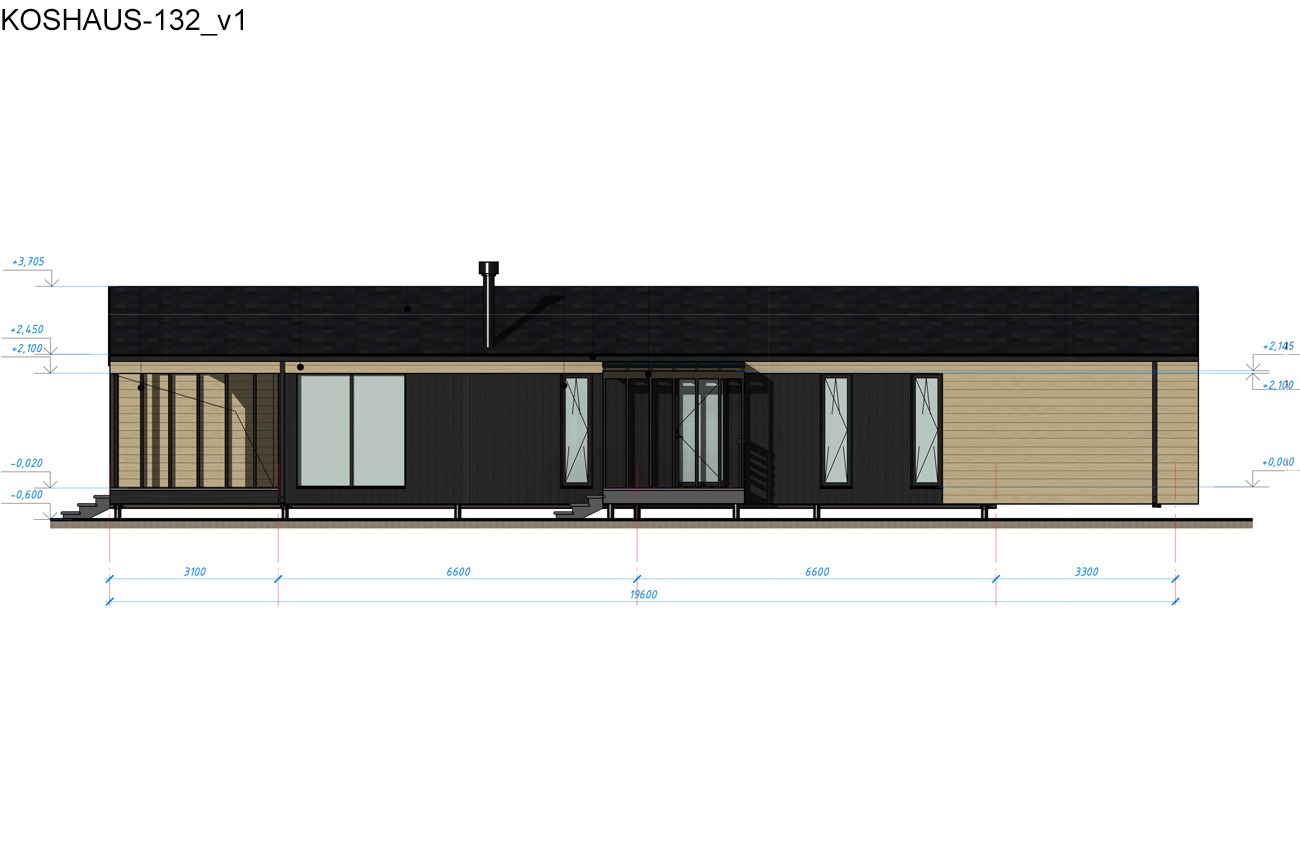 KOSHAUS-132 is designed specifically for a big family. The useful area of the house is 126.40 m2 with a spacious veranda of 29.02 m2 will accommodate not only a big family, but, if necessary, the same number of guests. 4 bedrooms, living room, kitchen, bathroom, storage room, vestibule. Veranda – a place for summer rest. The area of the house allows you to additionally place 2 bathrooms, a sauna or an office. There are various options for planning the house and orientation of the main facade.