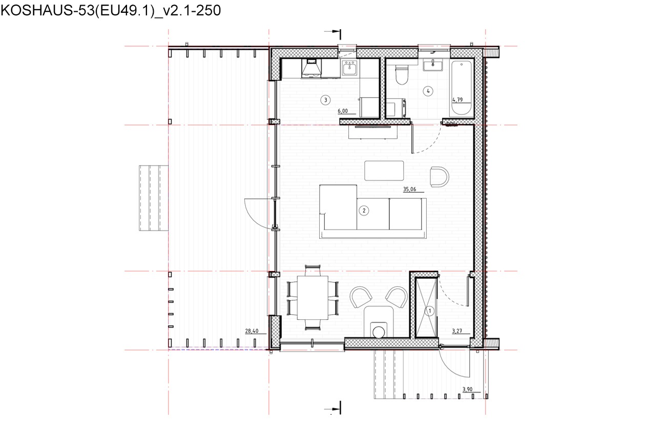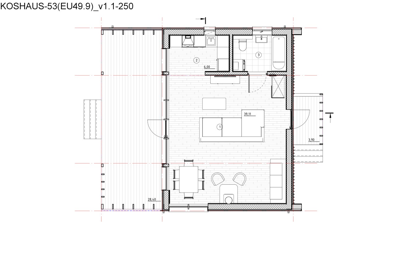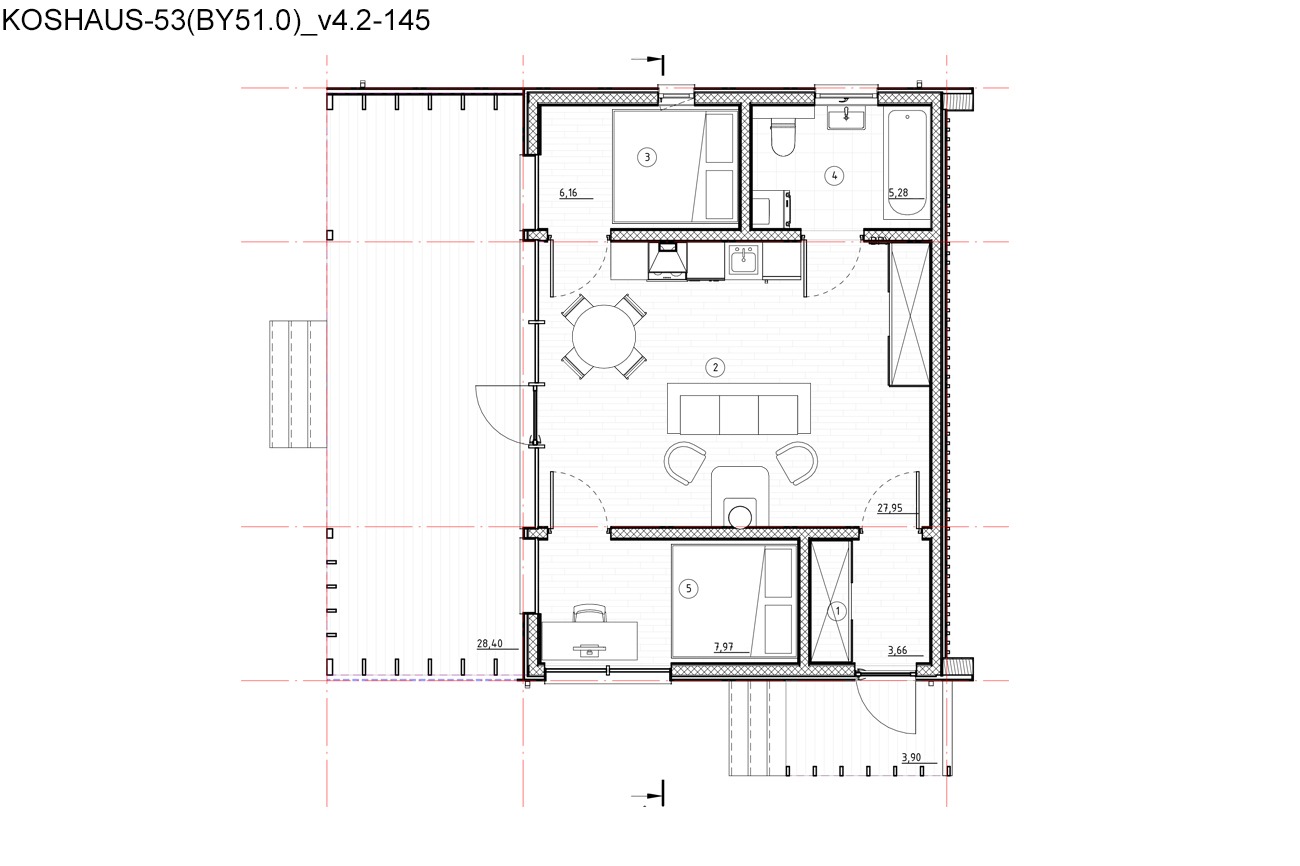 KOSHAUS-53 hat alles, was eine Person jeder Alters oder ein Paar ohne Kinder für ein komfortables Leben benötigen. Das Haus besteht aus einem Schlafzimmer, einem separaten Flur, einem Badezimmer, einer Küche, einem Wohnzimmer mit Essbereich, Fernsehenbereich und Kaminbereich sowie einem Abstellraum. In der Zukunft kann das Haus leicht in der Länge vergrößert werden. Die zusätzlichen Schlafzimmer, Arbeitszimmer, Badezimmer und andere Räume können eingefügt werden.