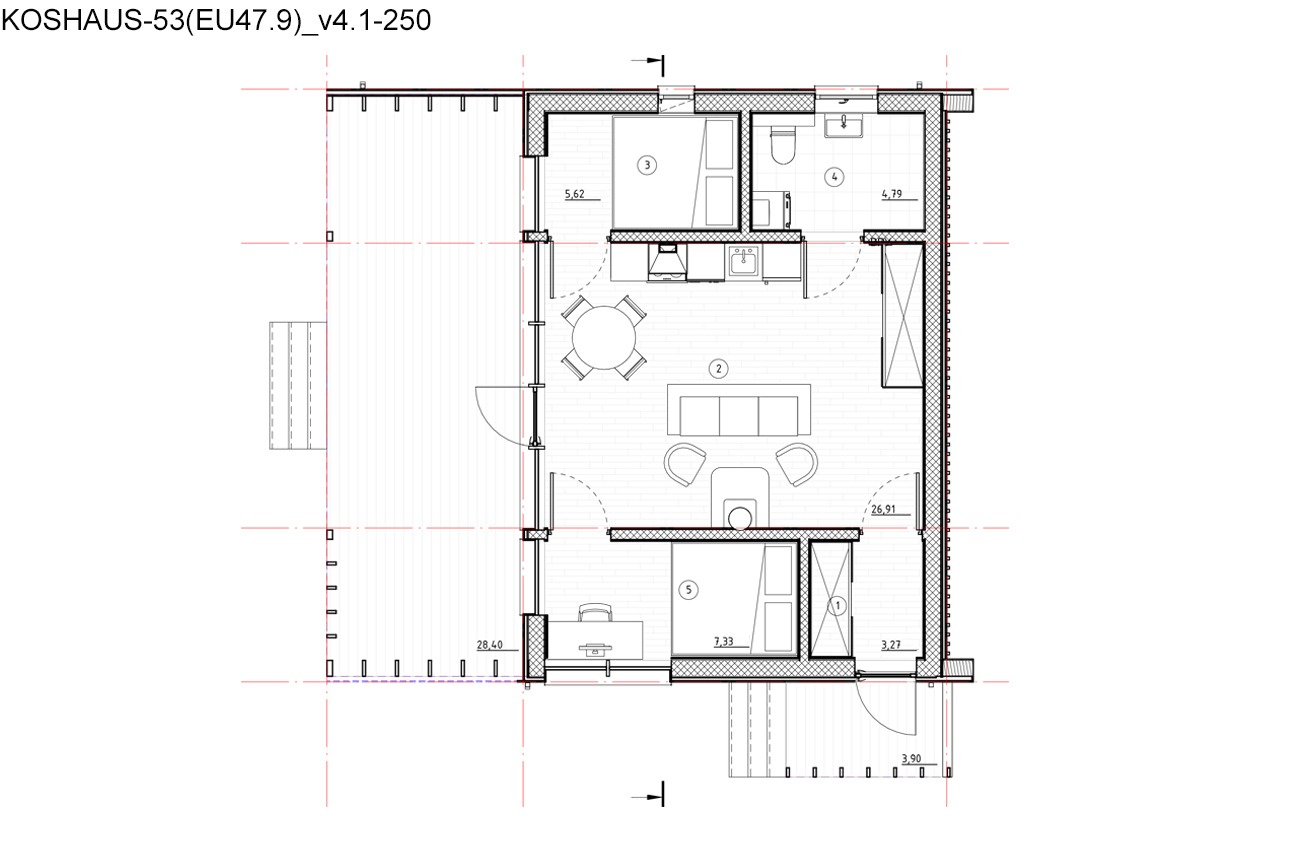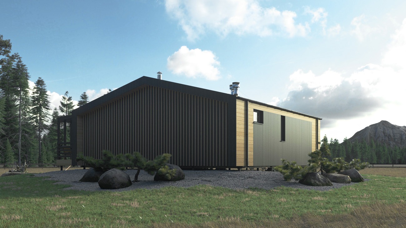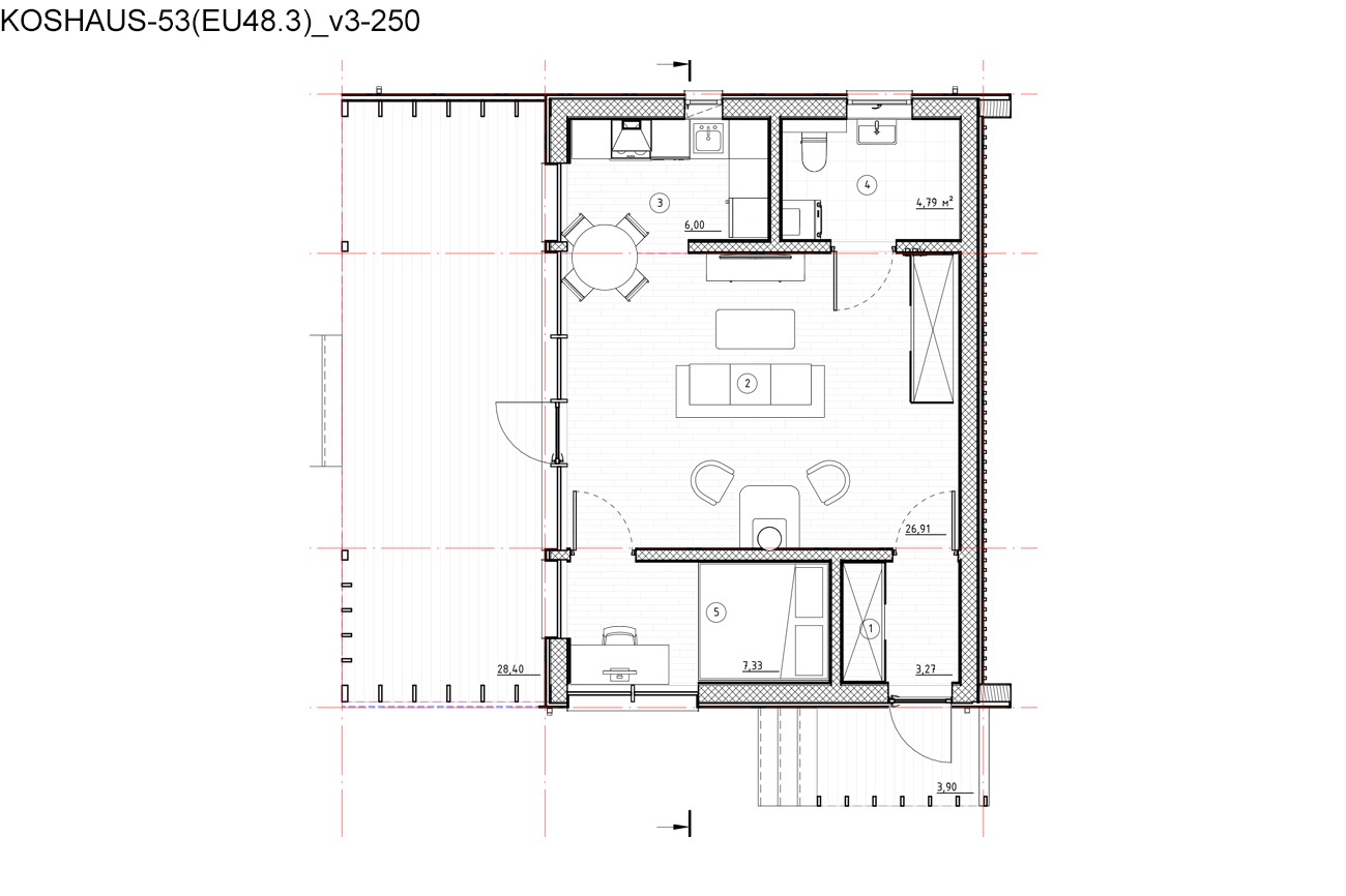 KOSHAUS-53 hat alles, was eine Person jeder Alters oder ein Paar ohne Kinder für ein komfortables Leben benötigen. Das Haus besteht aus einem Schlafzimmer, einem separaten Flur, einem Badezimmer, einer Küche, einem Wohnzimmer mit Essbereich, Fernsehenbereich und Kaminbereich sowie einem Abstellraum. In der Zukunft kann das Haus leicht in der Länge vergrößert werden. Die zusätzlichen Schlafzimmer, Arbeitszimmer, Badezimmer und andere Räume können eingefügt werden.
